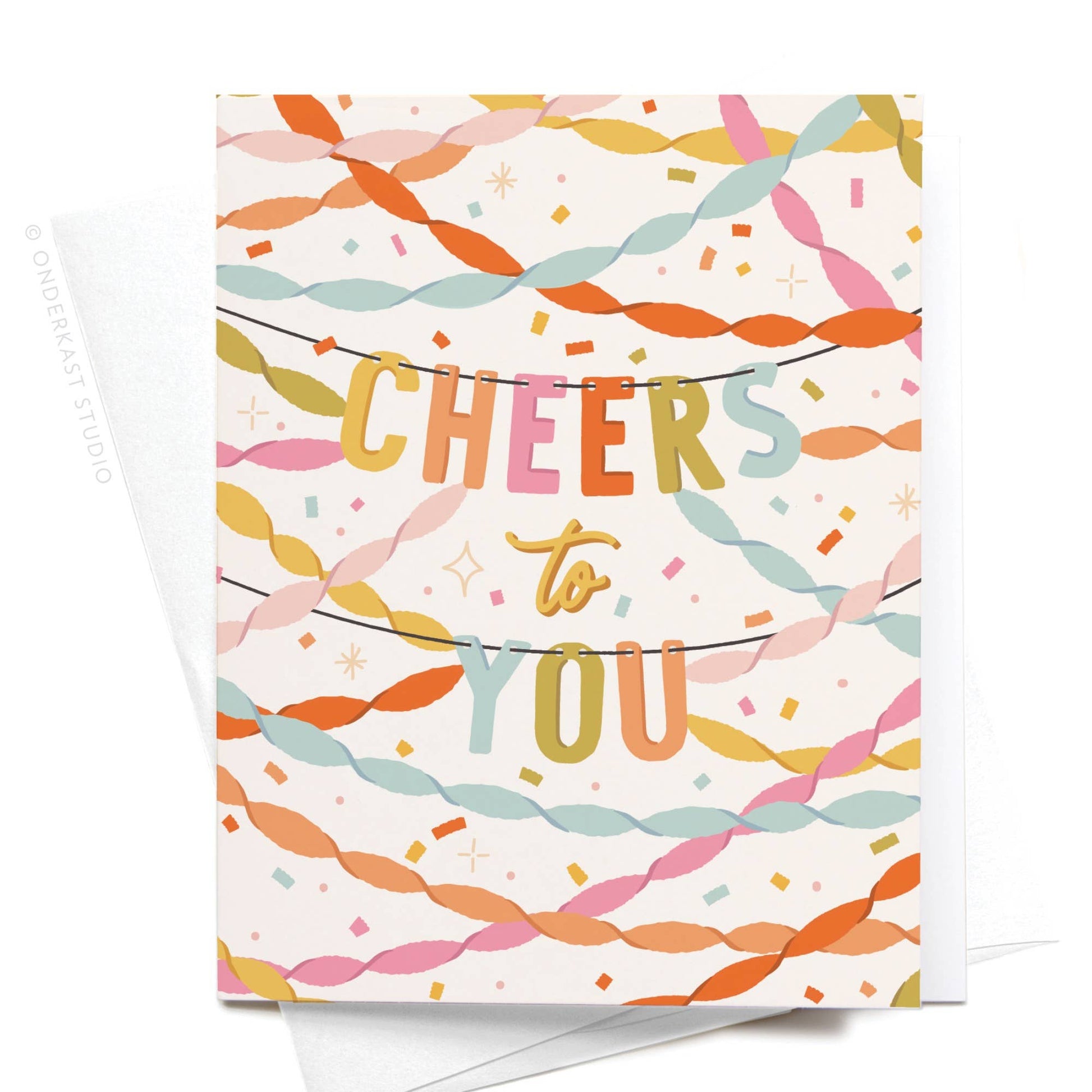 The Cheers to You Party Streamers Greeting Card bursts with vibrant colors and festive streamers, perfectly capturing the excitement of any celebration.