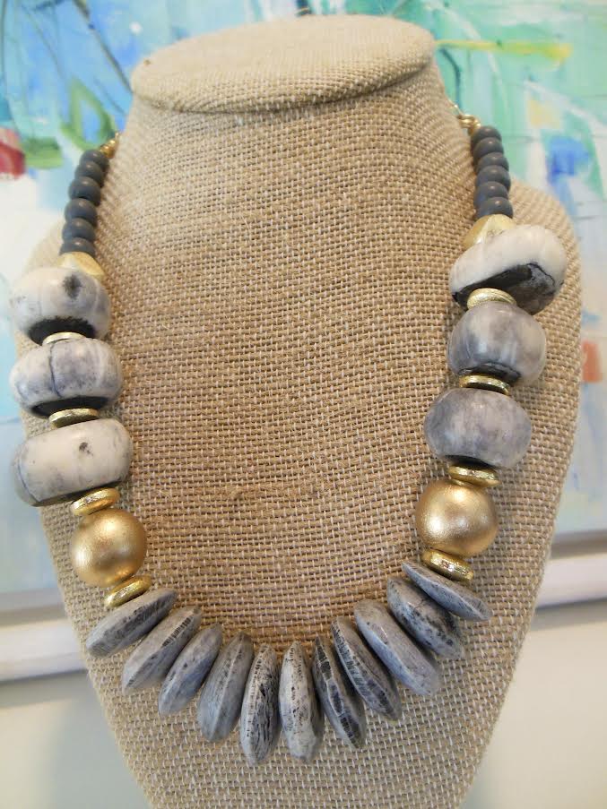 Rooted in natural textures and bold form, the Coastal Cross by LUSH exudes strength and grounded beauty. Featuring chunky, organic-inspired beads in earthy greys and blacks, paired with brushed gold accents, this piece brings a sense of raw elegance to your look. The center is lined with stacked, stone-like discs that add dimension and a handcrafted feel.