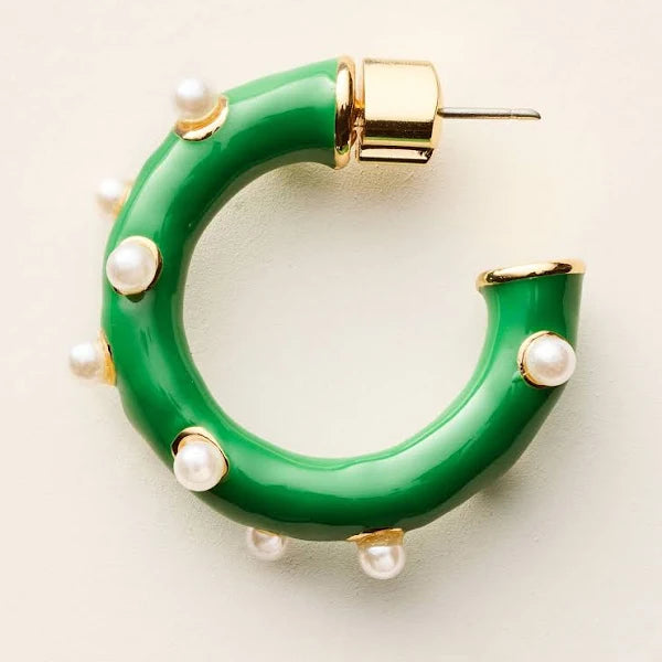 Make a statement without saying a word. These Emerald Pearl-Studded Hoop Earrings blend bold color with timeless charm, designed for those who love to stand out. The rich green enamel finish offers a modern, high-gloss look, while the scattered faux pearls add a touch of vintage-inspired elegance. Gold-tone accents elevate the design, giving it a luxe feel that’s perfect for both dressed-up and casual moments.