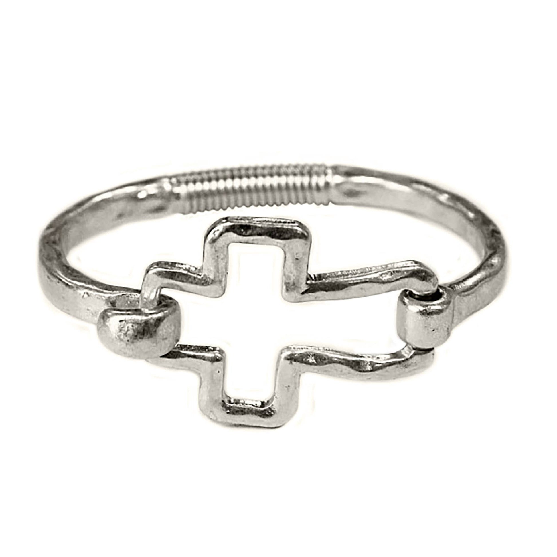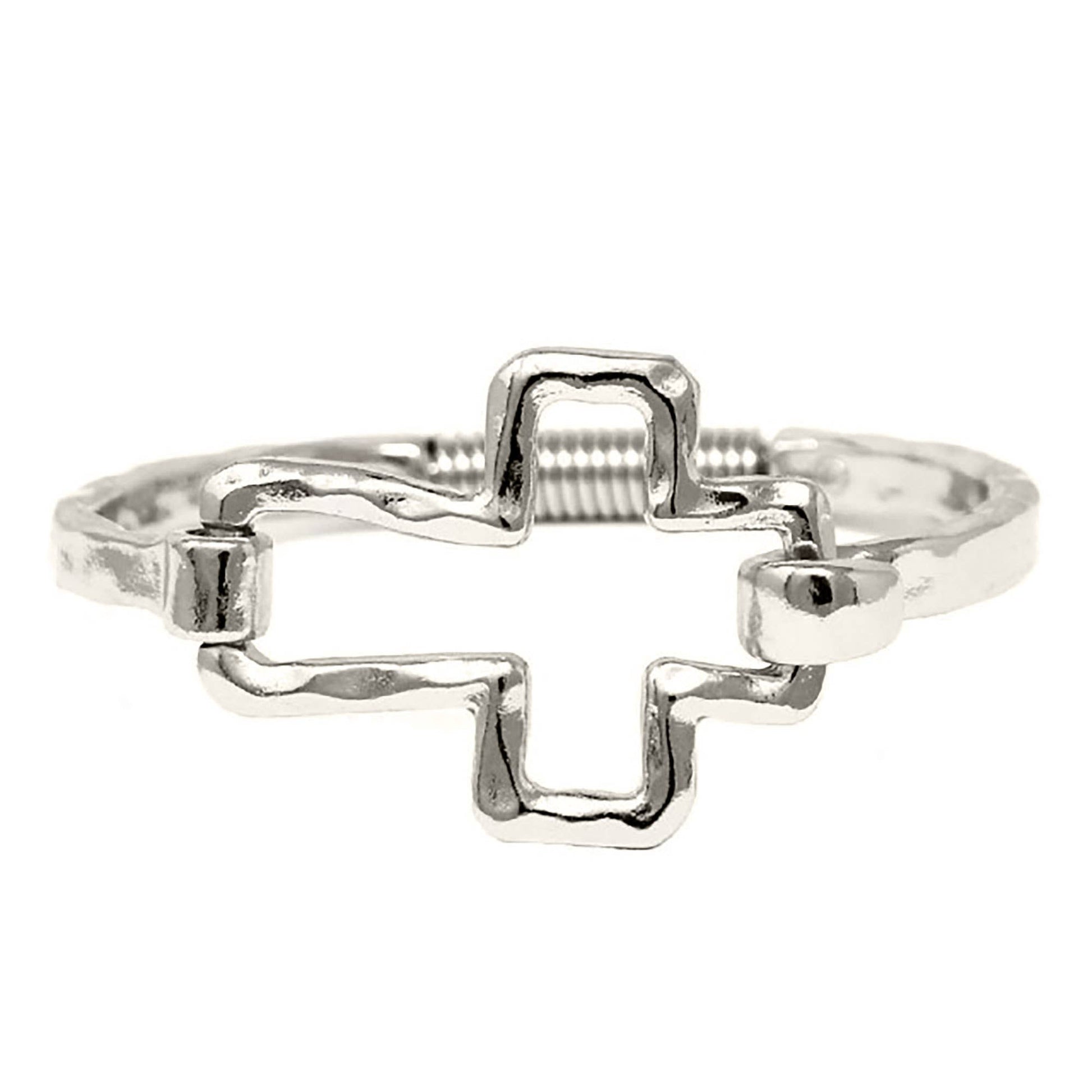 Our most popular jewelry item is back! The Hammered Cross Spring Hinge Bangle Bracelet is crafted with a unique, one of a kind aesthetic. Its standout design features a stylized cross integrated seamlessly into the band, creating a striking and meaningful centerpiece. The subtle hammered texture adds character and a touch of rustic charm, while the coiled detailing at the back enhances its artisanal appeal.