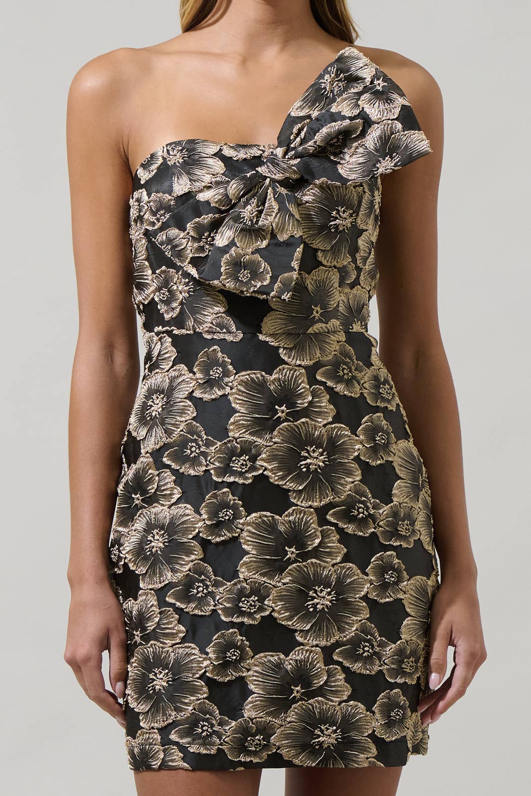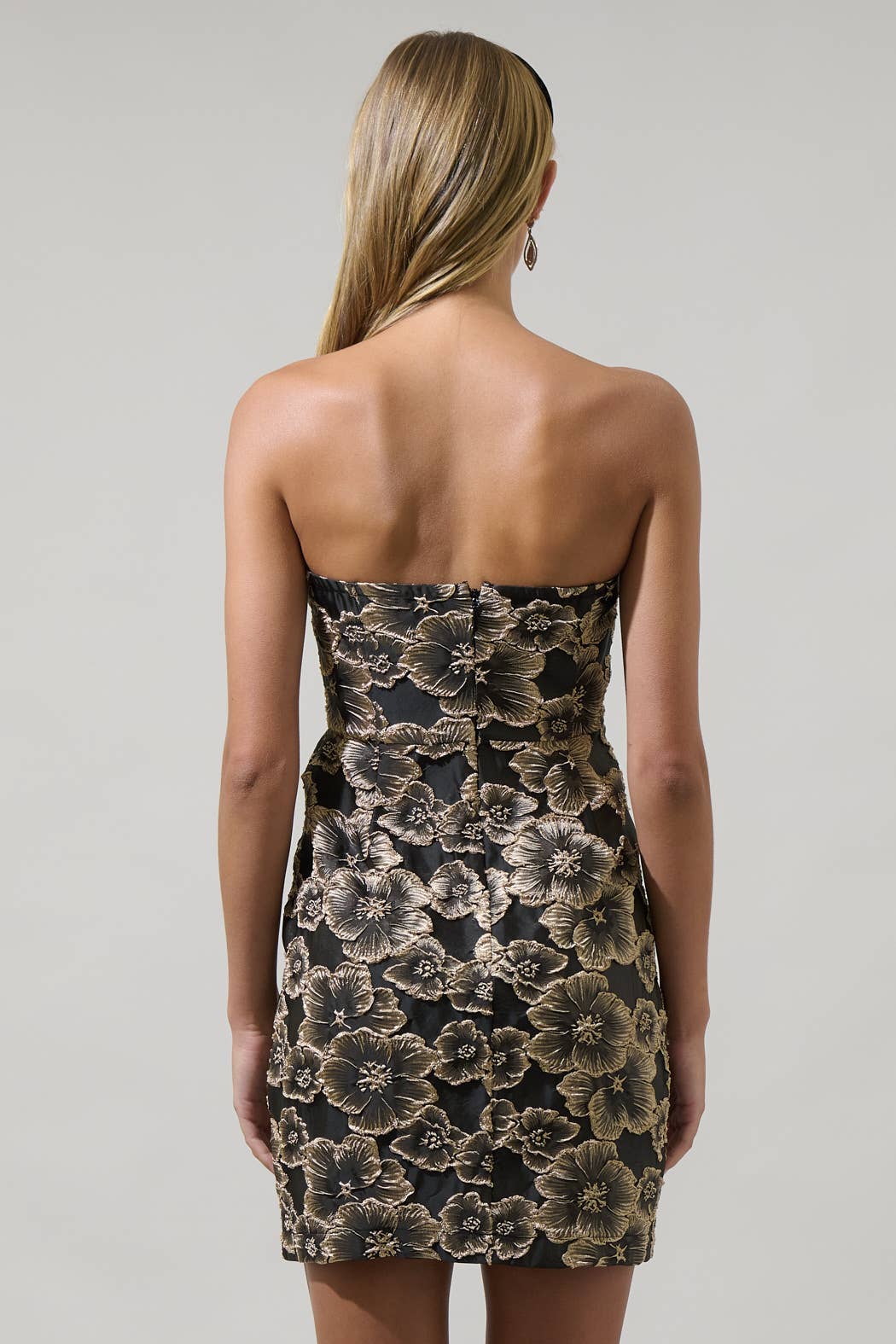Create a charming look when you wear the Jamille Jacquard Bow Strapless Mini Dress. It has a bow in the front with a gorgeous jacquard black floral print. It features a strapless design and has an invisible zipper in the back side. Wear it with heels and enjoy your evening or night.