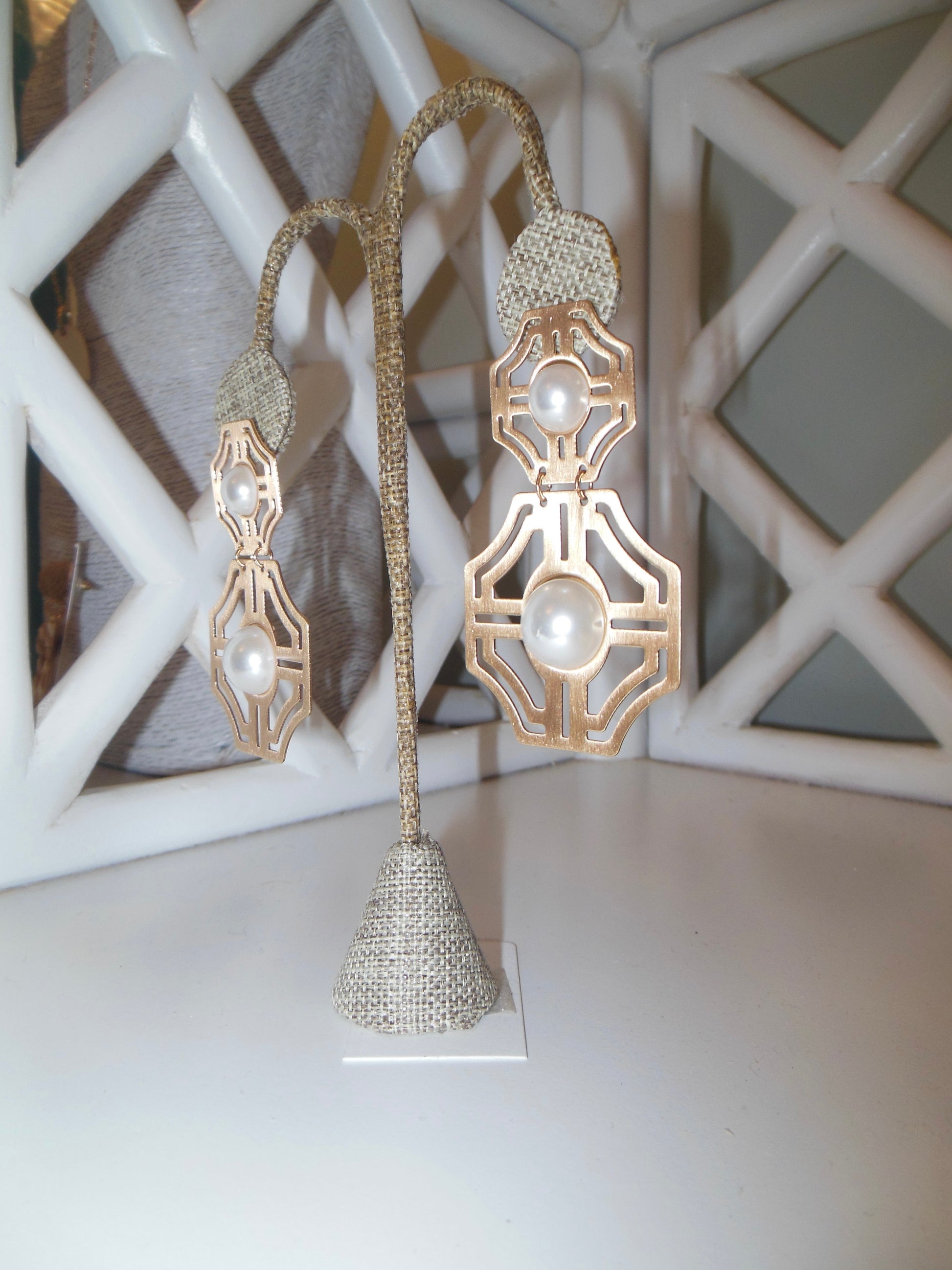 Make a bold statement with these stunning gold-tone octagon drop earrings, featuring luminous pearl accents at the center. The intricate openwork design adds a modern, architectural touch while the pearls bring timeless elegance. Perfect for elevating both casual and formal looks, these earrings are a must-have accessory for any fashion-forward wardrobe.