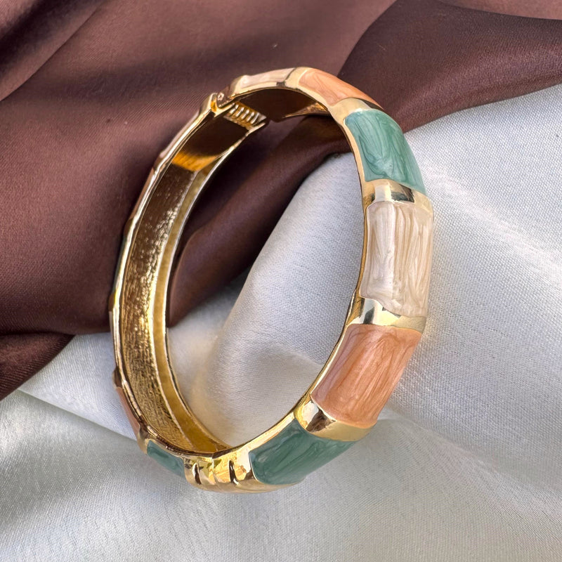 Add a touch of timeless elegance to your jewelry collection with this stunning gold bracelet. Featuring a sleek hinged design, it is beautifully inlaid with smooth, colorful segments in soft green, creamy white, warm peach, and subtle brown tones. Perfect for both everyday wear and special occasions, this bracelet effortlessly blends classic sophistication with a modern flair. Lightweight and comfortable, it makes an ideal gift or a stylish treat for yourself.