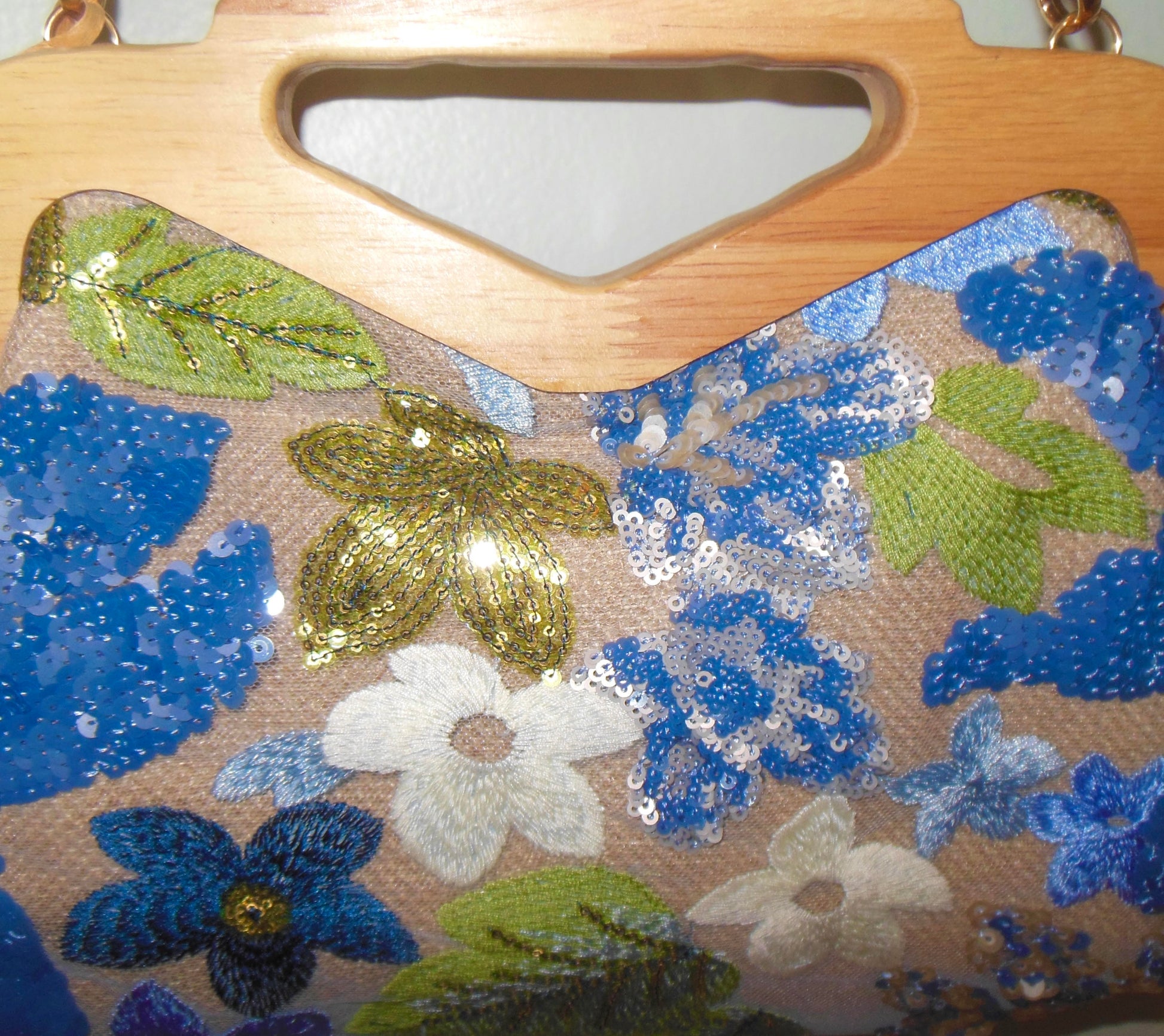 Add a pop of color and elegance to your collection with this stunning floral sequin handbag. Featuring intricate floral patterns, sparkling sequins, and a sleek wooden handle, this bag exudes charm and sophistication. The eye-catching design is perfect for dressing up any outfit, whether you're heading to a special event or just want to elevate your everyday look.