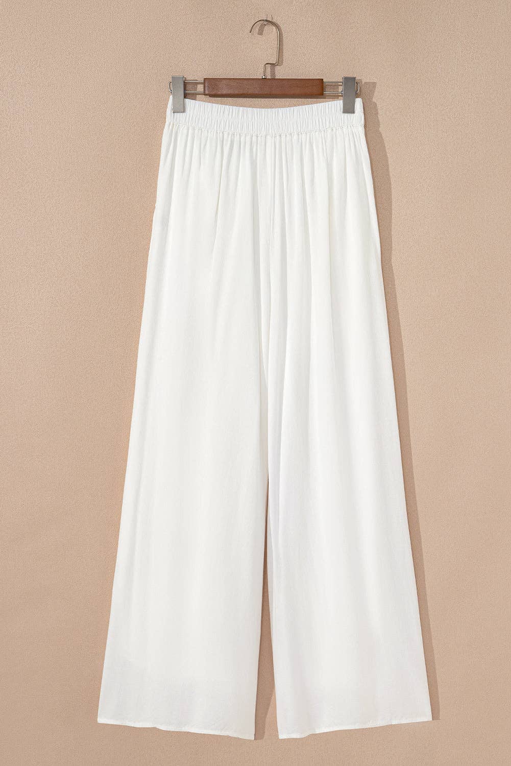 These white solid palazzo pants feature a drop waist design that exudes effortless sophistication. The pleated detailing adds a refined touch, while the wide-leg silhouette flatters by elongating and slimming your figure. A versatile half-elastic back waist ensures a comfortable, adjustable fit, making these pants perfect for both casual and polished looks.
