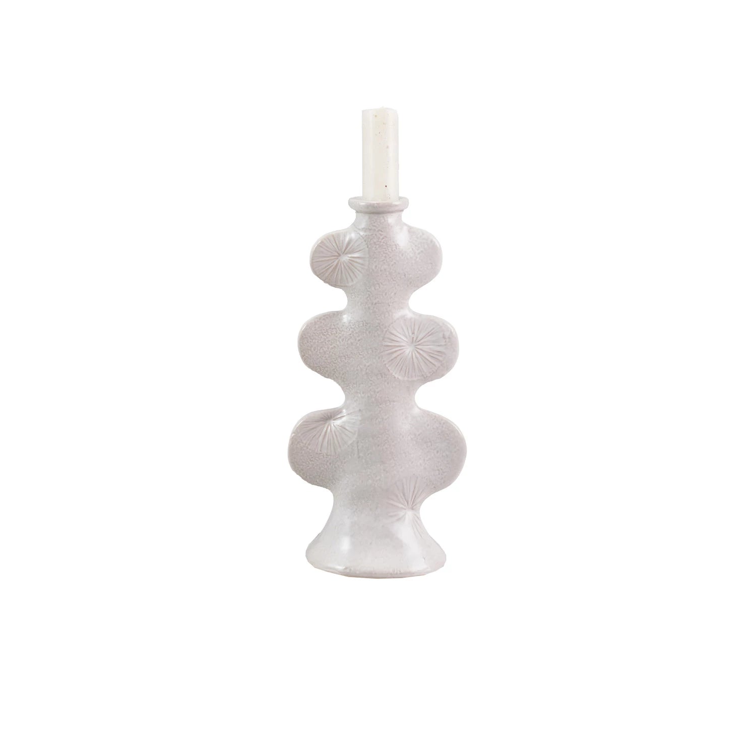 Elevate your candlelight with this elegant stoneware taper holder, featuring a beautifully embossed design that adds subtle texture and sculptural interest. Finished in a soft, matte white glaze, it brings a refined, timeless touch to your table, mantel, or shelf.