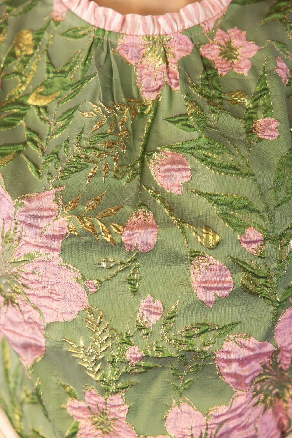 Step into effortless style with this beautiful Striped Ruffle Detailed Floral Jacquard Top. Featuring a vibrant floral puff sleeve top. The top boasts a stunning green base adorned with delicate pink and gold floral embroidery, complemented by playful ruffled trim and striped accents on the sleeves and neckline for a touch of vintage charm.