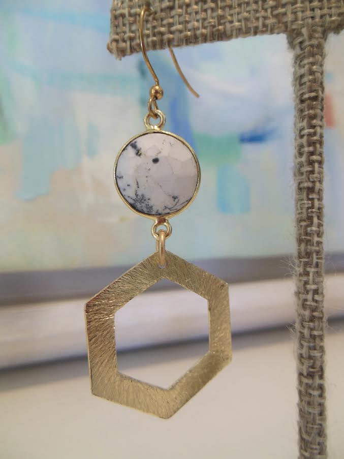 Add a touch of modern sophistication to your look with these stunning hexagon drop earrings. Featuring a sleek gold-tone hexagonal frame that elegantly dangles below a round, marble-inspired stone set in a delicate gold bezel, these earrings perfectly balance contemporary design with timeless elegance.